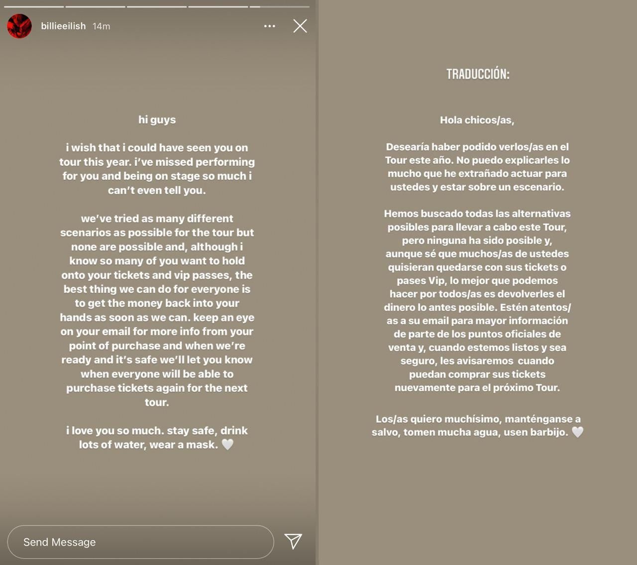Y añadió: "Estén atentos a su email para información de su punto de ventas y cuando estemos listos y sea seguro, le haremos saber cuándo podrán comprar entradas otra vez para la próxima gira. Los quiero muchísimo. Cuídense, tomen mucha agua y usen tapabocas".