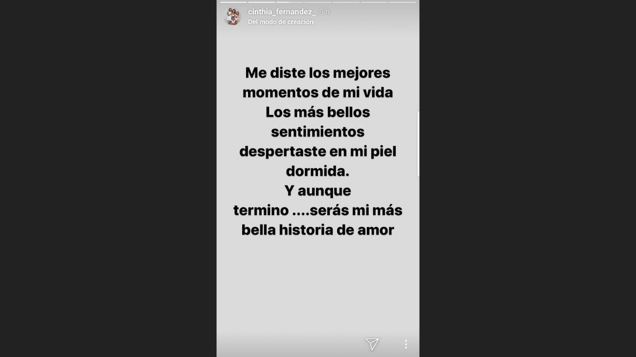 "Me diste los mejores momentos de mi vida. Los más bellos sentimientos despertaste en mi piel dormida. Y aunque terminó... Serás mi más bella historia de amor", fue el texto de la morocha para expresar su dolor. Y siguió: "Duele ver cómo no encajás más en la vida de alguien".