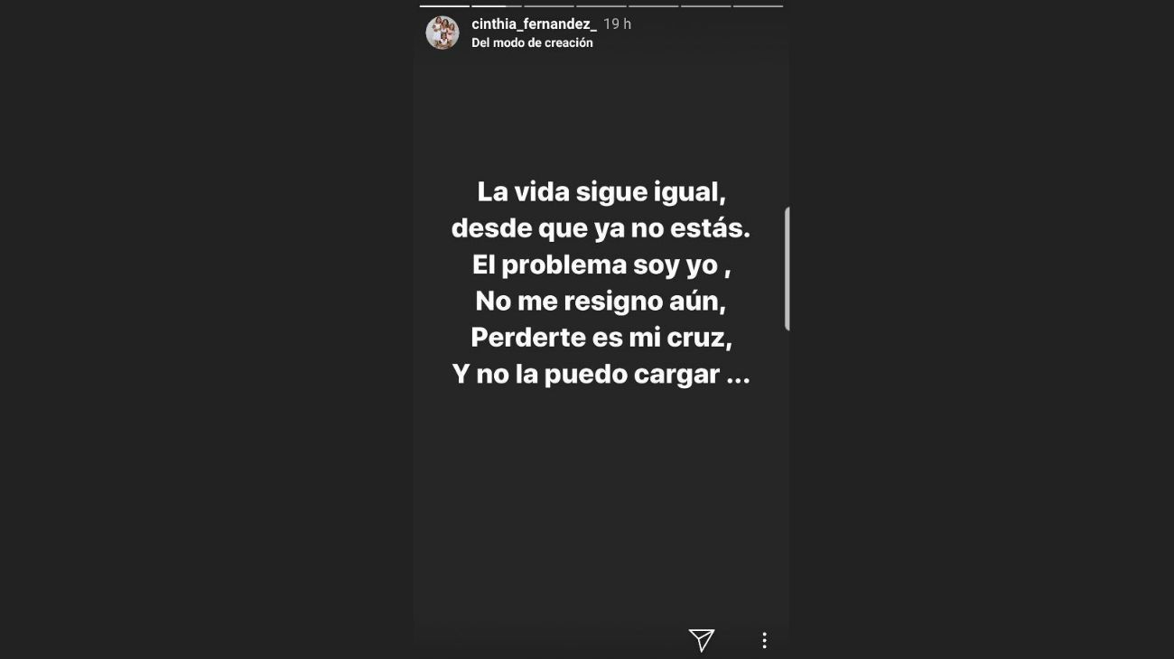 "La vida sigue igual,desde que ya no estás. El problema soy yo, no me resigno aún. Perderte es mi cruz y no la puedo cargar", "Cuando sujetar duele, es el momento de soltar", son otras de las frases que eligió Cinthia.