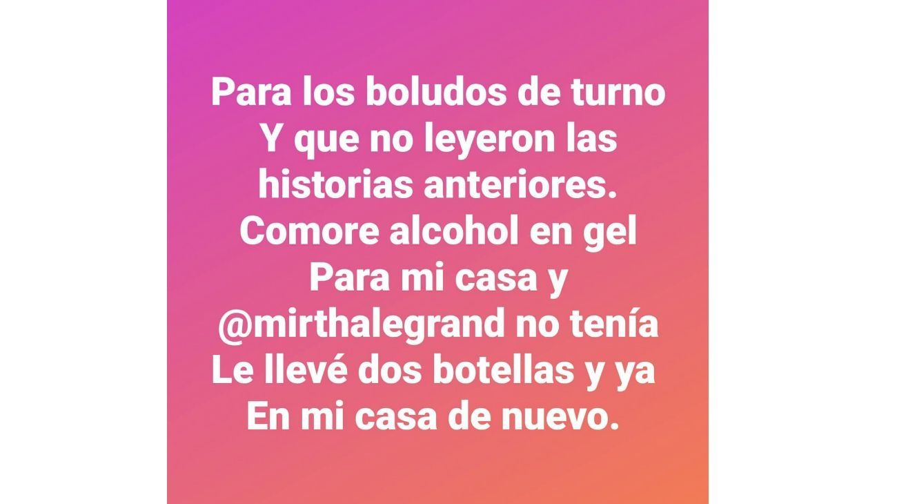 “Para los boludos de turno y que no leyeron las historias anteriores. Compré alcohol en gel para mi casa y Mirtha Legrand no tenía. Le llevé dos botellas y ya. Ya estoy en mi casa de nuevo”, respondió contundente el productor, adjuntando una copia del permiso de circulación que le otorgó el Gobierno de la Ciudad de Buenos Aires.