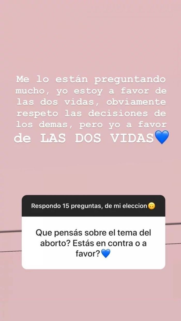 Su respuesta llamó la atención ya que por primera vez se animó a hablar de sus orígenes. Luego, dejó en claro su postura a favor de las dos vidas sobre el tema aborto legal: "Me lo están preguntando mucho. Yo estoy a favor de las dos vidas, obviamente respeto las decisiones de los demás, pero yo estoy a favor de las dos vida".