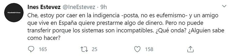 Ayer por la tarde la actriz volvió a dirigirse a sus seguidores y se refirió al momento personal que está atravesando: "Che, estoy por caer en la indigencia -posta, no es eufemismo- y un amigo que vive en España quiere prestarme algo de dinero. Pero no puede transferir porque los sistemas son incompatibles. ¿Qué onda? ¿Alguien sabe como hacer?”.