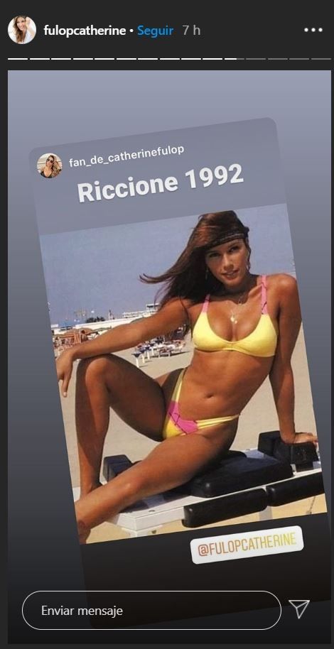 En la pic se la puede ver a la mamá de Oriana Sabatini con una bikini amarilla y rosa muy ajustada. La imagen fue compartida por la misma Catherine Fulop en sus historias de Instagram, agregando el dato del año del recuerdo retro, 1992.