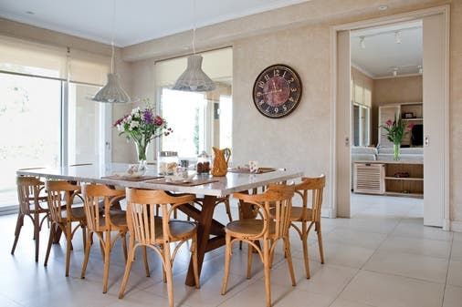 Un comedor diario con una gran mesa de mármol y sillas de madera decoran el espacio, que invita a degustar aquellas exquisiteces. El living, es espacio acogedor, donde también los tonos neutros reinan.