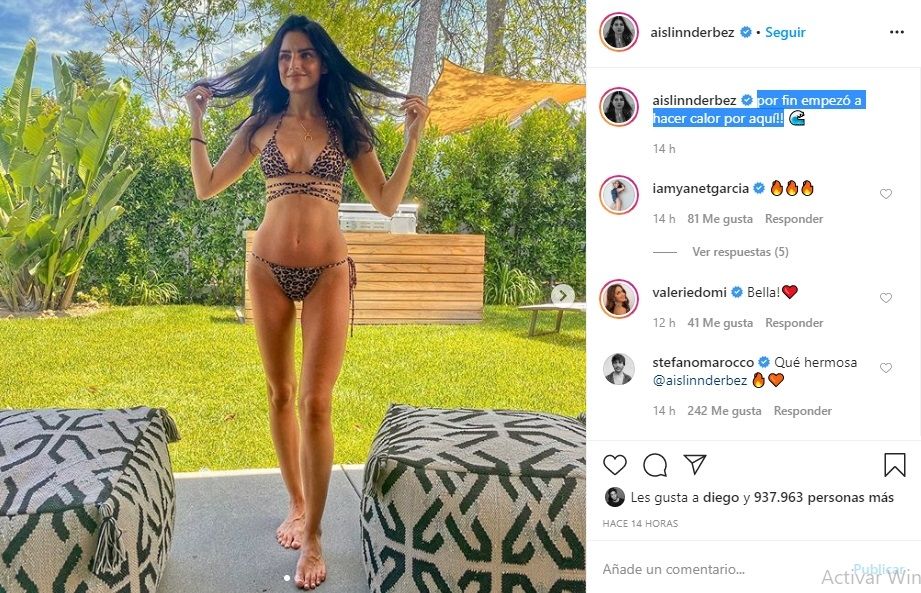 En tanto que en la descripción de la misma Aislinn escribió una frase donde explicó el por que de ese diminuto traje de baño: "Por fin empezó a hacer calor por aquí".