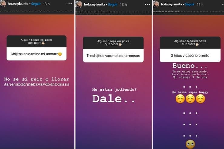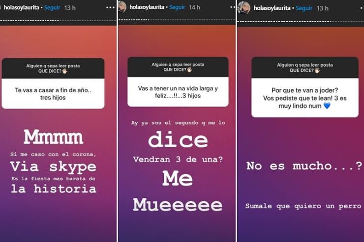 Asombrada por las respuestas, preguntó: "¿Es una joda? ¿Me están cargando?", y un seguidor le respondió: "¿Por qué te van a joder? ¡Vos pediste que te lean! Tres es muy lindo número". La novia de Cabré retrucó: "¿Pero no es mucho? Sumale que quiero un perro" .