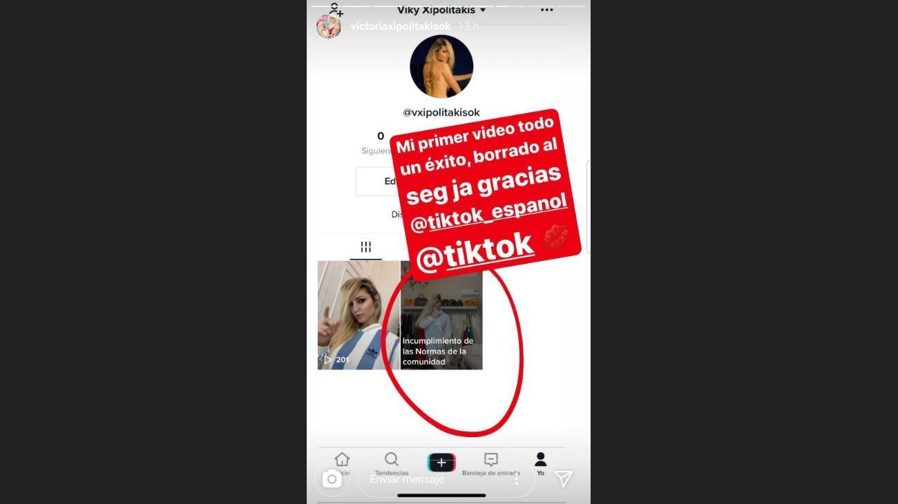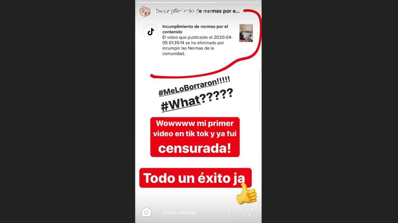 "Woow, mi primer video en Tik Tok y ya fui censurada. Todo un éxito ja", ironizó en sus historias.