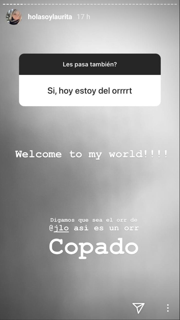 "¿No les pasa que hay días que la llevan bárbaro y otros que la pasan para el orrr...", preguntó Laurita a sus fans. Y agregó: "Sí, hoy estoy del orrrr..."
