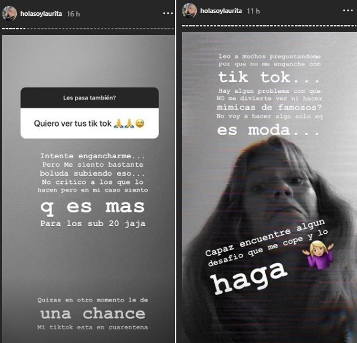 Y agregó: "Intenté engancharme pero me siento bastante boluda subiendo eso. No critico a quienes lo hacen pero en mi caso siento que es más para los sub 20. A lo mejor en otro momento le de una chance, por ahora mi TikTok está en cuarentena".