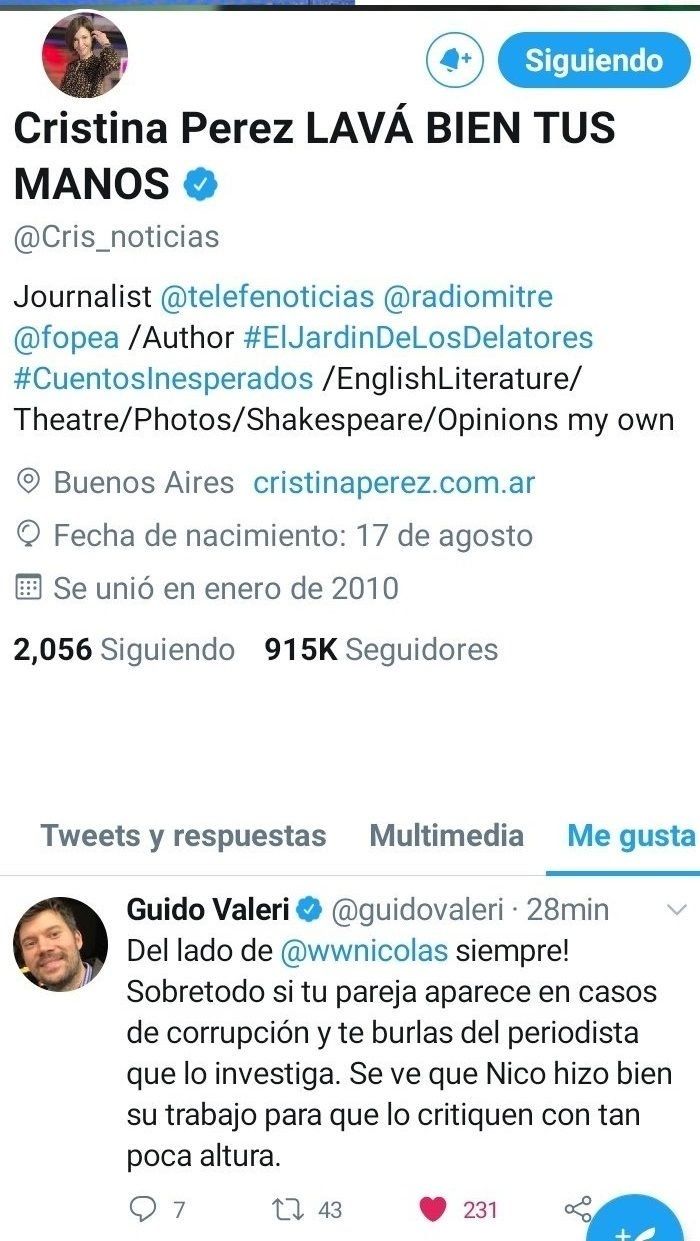 "Del lado de @wwnicolas siempre! Sobretodo si tu pareja aparece en casos de corrupción y te burlas del periodista que lo investiga. Se ve que Nico hizo bien su trabajo para que lo critiquen con tan poca altura", escribió el usuario al que Cristina le dio un "me gusta".