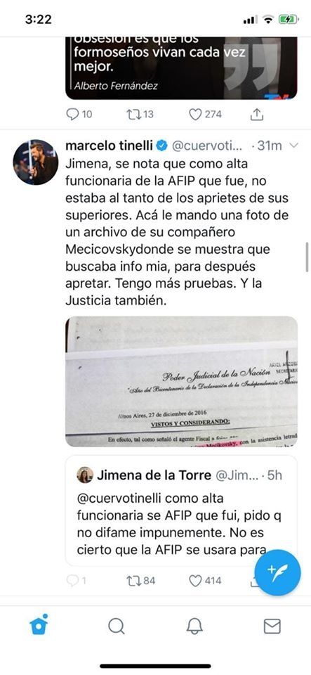 Jimena de la Torre, jefa de despacho de Cristian Ritondo y ex subdirectora de la Agencia Federal de Ingresos Públicos, cruzó a Tinelli, provocando que este exhiba documentación que lo involucra como un presunto extorsionado durante la gestión de Cambiemos. “Como alta funcionaria de AFIP que fui, pido que no difame impunemente. No es cierto que la AFIP se usara para apretar. Jamás se utilizó la información para armar carpetazos como lo hacia @CFKArgentina. AFIP se gestionó en base a procesos reglados sin discrecionalidad”.