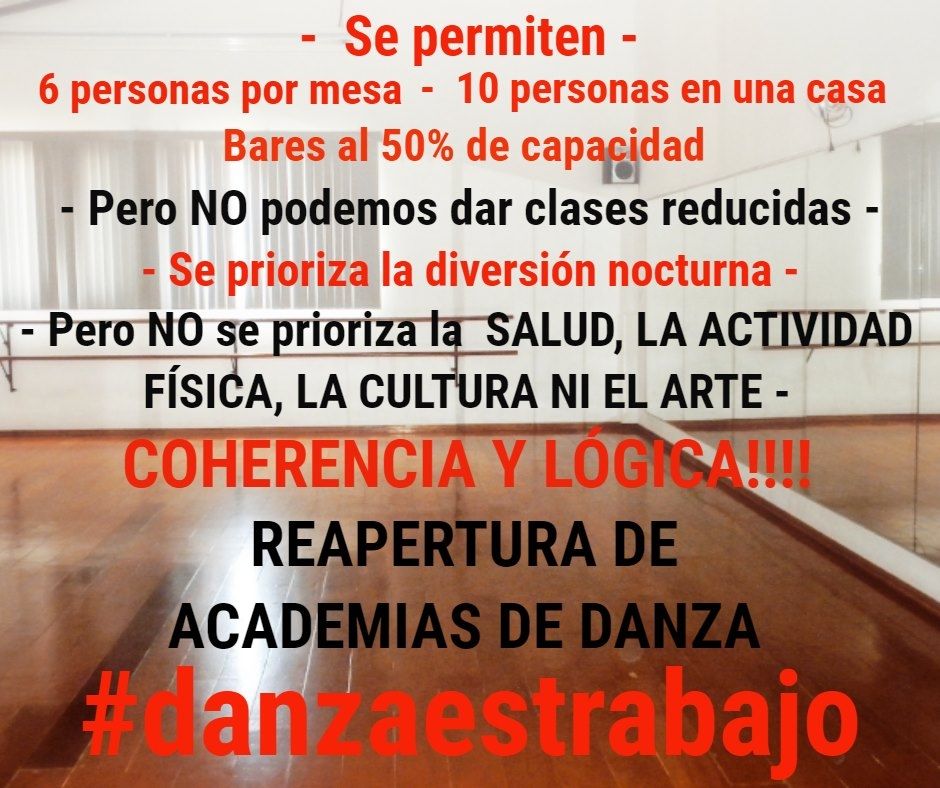 Por lo pronto, hacedores culturales aguardan la reactivación de clases y talleres. Desde el “Cuerpo de Delegades Teatreres y Esceniques” ya han presentado a las autoridades provinciales un modelo de protocolo de acción para el retorno y se encuentran expectantes de una pronta respuesta. A su vez, profesores de otras disciplinas artísticas, como la danza, también están inquietos al ver que está permitido ir a un bar, juntarse diez personas en una casa y ellos no tienen la posibilidad de dar clases a grupos reducidos. Argumentan que se está priorizando la actividad nocturna frente a la salud, la actividad física, la cultura y el arte. Encauzan este reclamo bajo el slogan de “la danza es trabajo”.