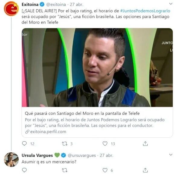 "Por el bajo rating, el horario de Juntos Podemos Lograrlo será ocupado por Jesús, una ficción brasileña. Las opciones para el conductor en el canal", informó el medio. Y Vargués, filosa, respondió. "¿Asumir que es un mercenario?", comentó.