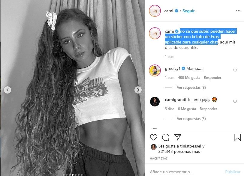 Además en la descripción invitó a sus fans a que hagan un sticker con la fotografía donde aparece con su mascota. "No se que subir, pueden hacer un sticker con la foto de Eros, aplicable para cualquier chat", fue lo que escribió Cami en la descripción.