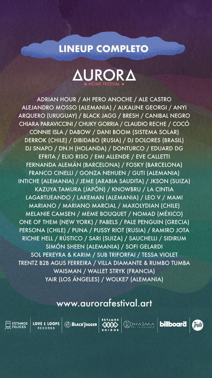 Aurora Home Festival es el primer festival mendocino de escala internacional que recreará un encuentro real desde la virtualidad con el objetivo de ayudar económicamente a los artistas afectados por el coronavirus. El mismo se desarrollará el 18, 19 y 20 de julio a través de la plataforma www.aurorafestival.art y tendrá un valor contribución que luego se dividirá equitativamente entre todos los artistas y emprendedores que formaron parte del evento, en pos de reactivar la industria dentro de un marco de cuarentena y paralización de la industria. Todo lo recaudado será distribuido entre todos los artistas que participarán del festival, entre los que se encuentran las Pussy Riot, la banda que estuvo presa en Rusia por sus protestas sociales.