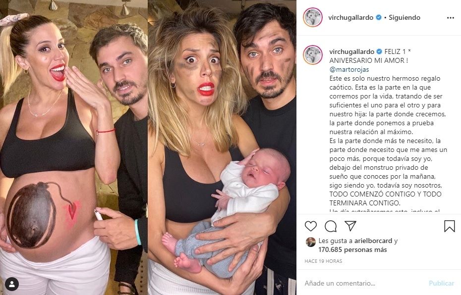 Hace horas, Gallardo compartió una divertida producción de fotos que realizaron para celebrar su primer aniversario. De un lado se los ve en los últimos días del embarazo con una bomba dibujada en su panza. Y en paralelo, se ve a la pareja con un aspecto descuidado debido a la explosión de la bomba: su pequeña hija.