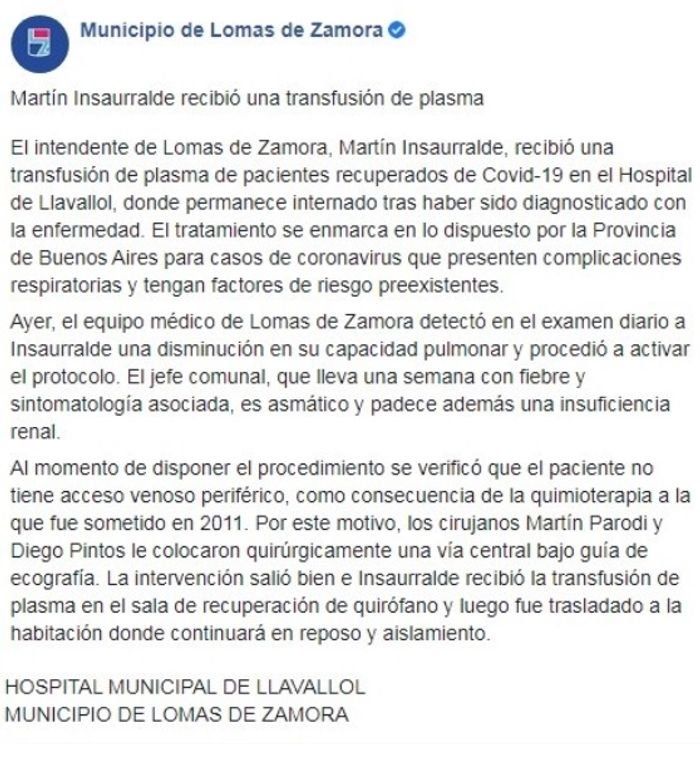 En el comunicado se detalla: "El tratamiento se enmarca en lo dispuesto por la Provincia de Buenos Aire para casos de coronavirus que presenten complicaciones respiratorias y tengan factores de riesgo preexistentes. Ayer el equipo médico de Lomas de Zamora detectó en el examen diario a Insaurralde una disminución en su capacidad pulmonar y procedió a activar el protocolo".