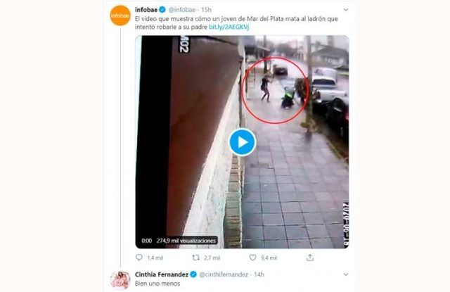 Cinthia Fernández se enteró del hecho al leer la noticia en las redes sociales y lanzó un polémico comentario que fue duramente criticado. "El video que muestra cómo un joven de Mar del Plata mata al ladrón que intentó robarle a su padre", titulaba la noticia. Por lo que la panelista disparó: "Bien, uno menos".