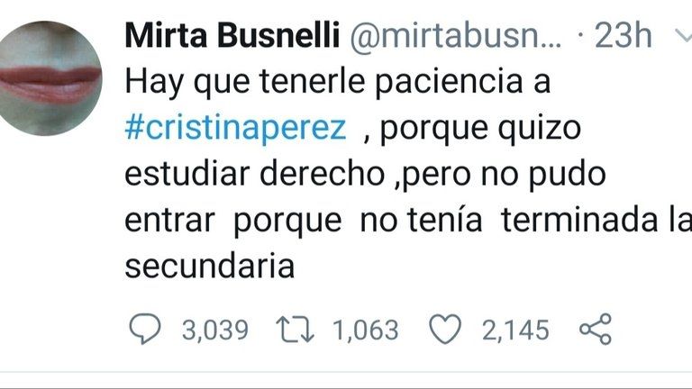 "Hay que tenerle paciencia a #cristinaperez, porque quizo (sic) estudiar derecho, pero no pudo entrar porque no tenía terminada la secundaria", publicó Mirta.