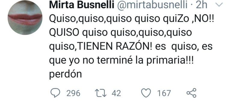 Finalmente, este jueves la actriz se convirtió en tendencia y utilizó la misma red social para aceptar su error. "Quiso, quiso, quiso, quiso, quiZo, NO!! QUISO, quiso, quiso, quiso, quiso, quiso. TIENEN RAZÓN! Es quiso, es que yo no terminé la primaria!!! Perdón", escribió Mirta,