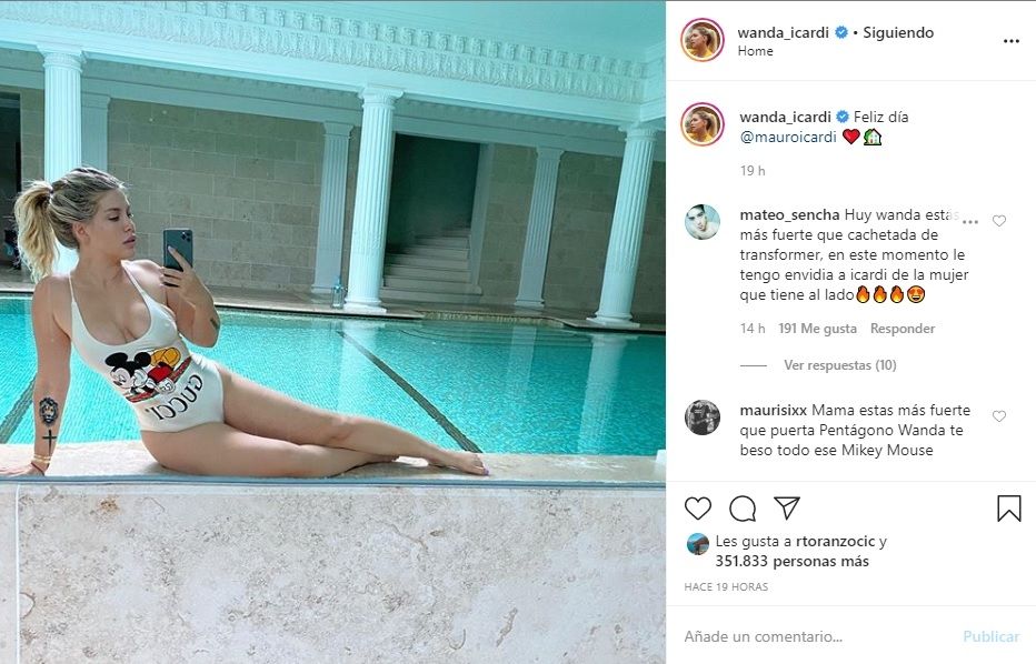 Hace horas Wanda sorprendió a sus fanáticos con una publicación en su Instagram donde saludó al jugador en su día. Se la ve luciendo una hermosa malla blanca enteriza con el dibujo del simpático Mickey Mouse en la imponente piscina techada de su casa.
