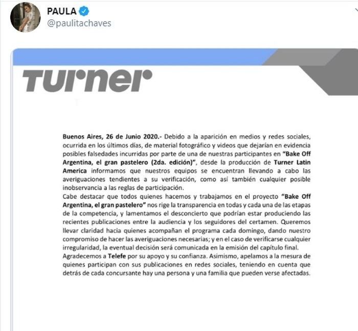 En este marco y ante la viralización de distintas imágenes, la productora Turner Latin America encargada del ciclo gastronómico emitió un comunicado este viernes, argumentando que iniciarán una investigación sobre los participantes para saber el historial de las finalistas en el rubro de cocina.