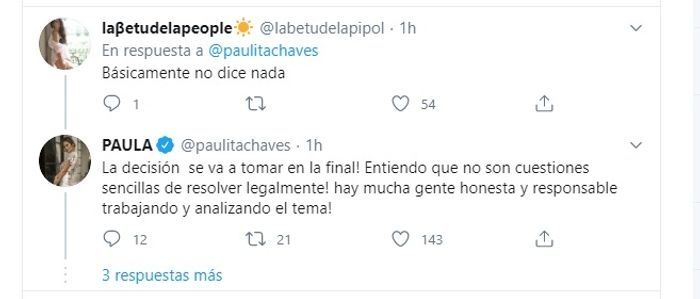 Intentando salvar la tensa situación, Paula respondió: "La decisión se va a tomar en la final! Entiendo que no son cuestiones sencillas de resolver legalmente! Hay mucha gente honesta y responsable trabajando y analizando el tema!".