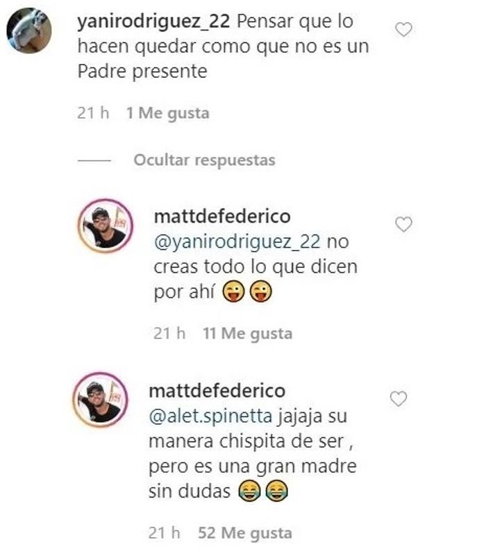 "Pensar que lo hacen quedar como que no es un padre presente", reflexionó una seguidora. A lo que él respondió por las noticias que surgen: "No creas todo lo que dicen por ahí". Y luego remarcó a Fernández en su rol de mamá: "Su manera chispita de ser... Pero es una gran madre, sin dudas" .