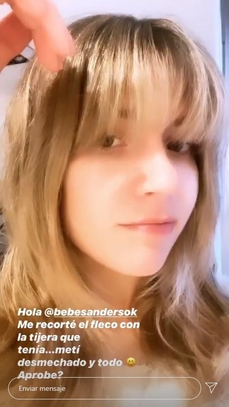 Hace días dejó a todos mudos al mostrar el cambio de look que ella misma se realizó. "Me recorté el fleco con la tijera que tenía... metí desmechado y todo. Aprobé?", escribió en la historia donde lució el corte.