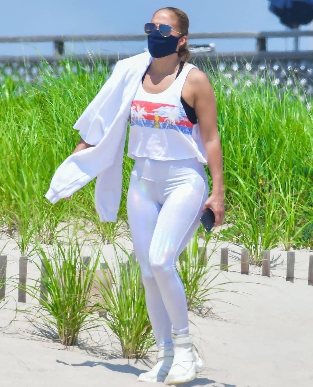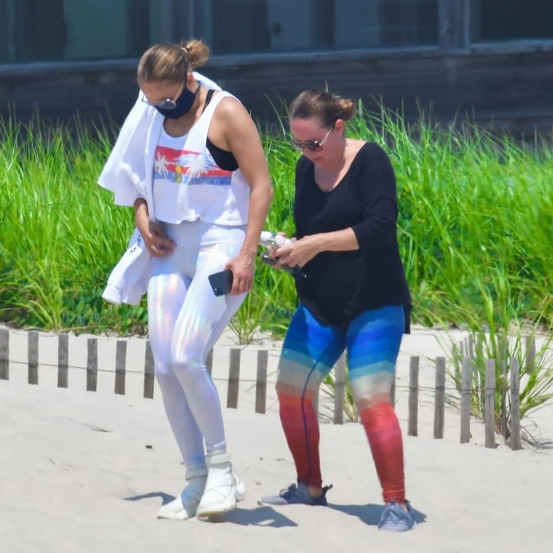 En las pics se puede ver Jlo luciendo una calza, zapatillas y musculosa blanca, lentes de sol y un tapaboca negro.