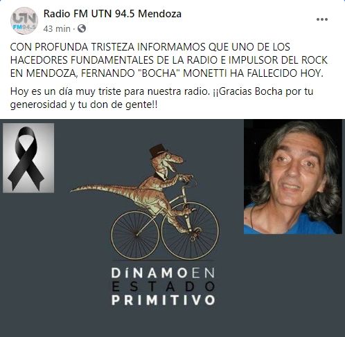 "Con profunda tristeza informamos que uno de los hacedores fundamentalesde la radio e impulsor del rock en Mendoza, Fernando "Bocha" Monetti, ha fallecido. Hoy es un día triste para nuestra radio. ¡Gracias Bocha por tu generosidad y tu don de gente!", informaron.