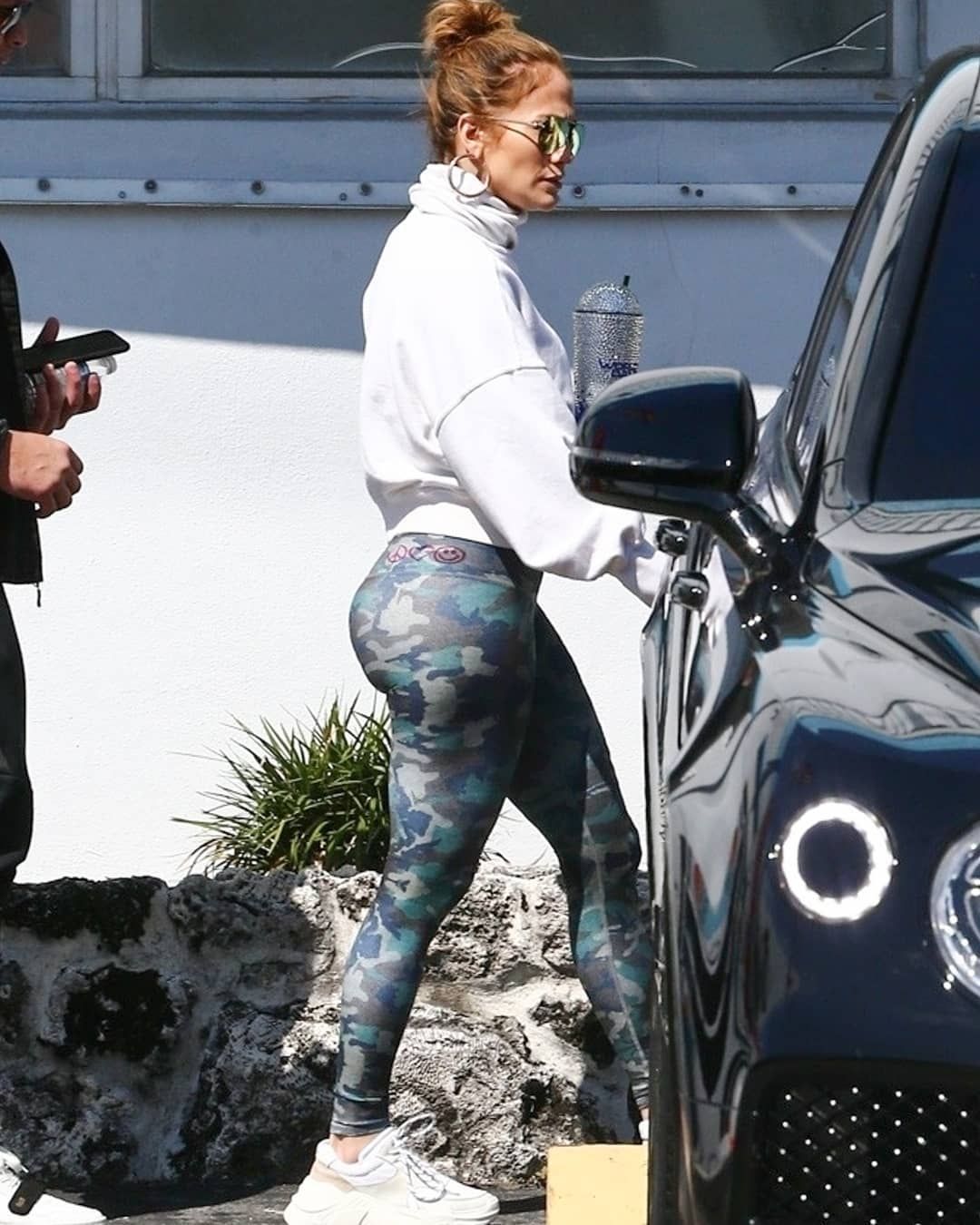 En esta pic de Jennifer López, se la puede observar con un vaso de plástico en una de sus manos, con lentes de sol puestos, campera y zapatillas blancas y una calza color militar.