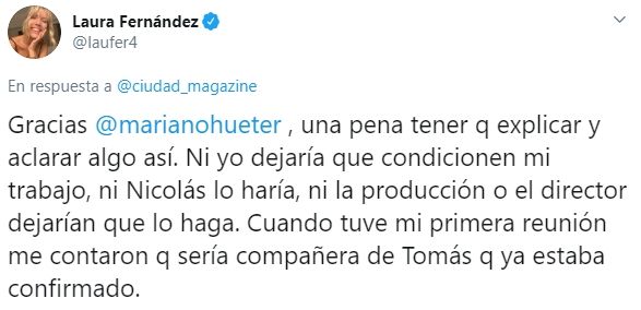 En su momento, la bailarina ya se había manifestó desde su cuenta de Twitter. "Es una pena tener que explicar y aclarar algo así. Ni yo dejaría que condicionen mi trabajo, ni Nicolás lo haría, ni la producción o el director dejarían que lo haga. Cuando tuve mi primera reunión me contaron quye sería compañera de Tomás que ya estaba confirmado".