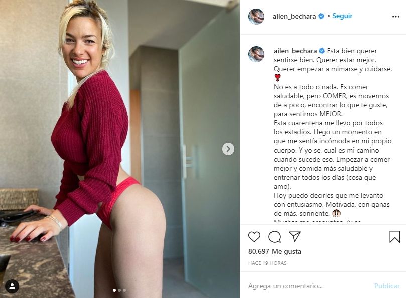 "Está bien querer sentirse bien. Querer estar mejor. Querer empezar a mimarse y cuidarse. No es a todo o nada. Es comer saludable, pero COMER, es movernos de a poco, encontrar lo que te guste, para sentirnos MEJOR", comenzó Ailén en el posteo que realizó en su cuenta oficial de Instagram.