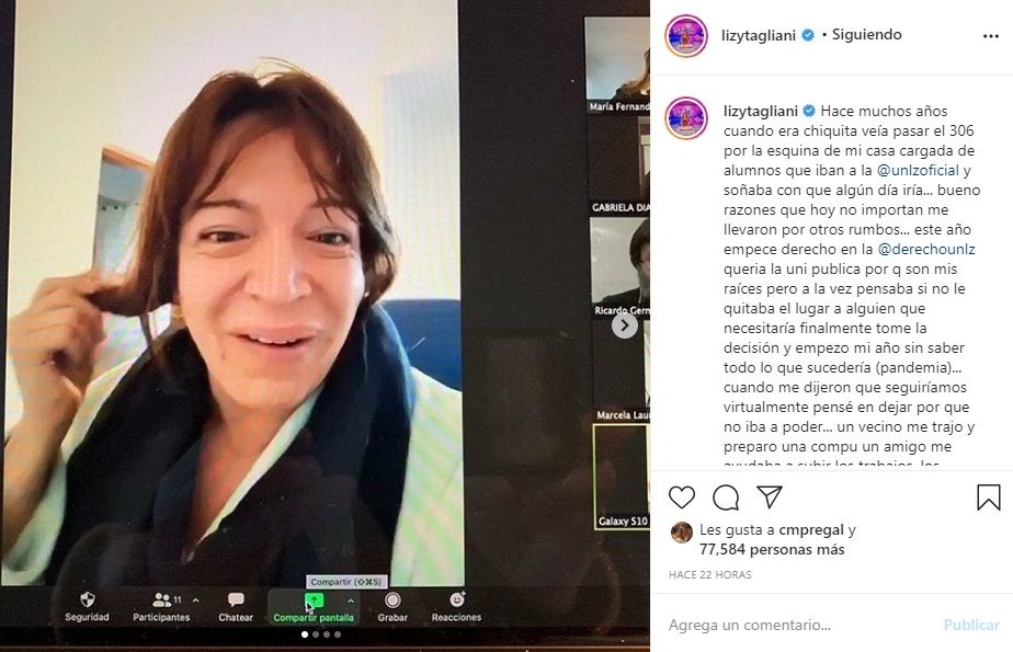 Lizy Tagliani se ganó rápidamente el cariño y el público con sus divertidos y desopilantes comentarios en la pantalla chica. Hoy se encuentra más feliz que nunca, no sólo porque esta noche vuelve a la televisión de la mano de Marley, sino también por un reciente logro académico que compartió con sus fans.
