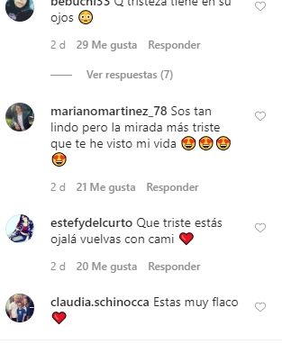 Lo cierto es que el actor volvió a utilizar su cuenta de Instagram para compartir una foto de él en su casa de Nordelta. La imagen provocó la reacción de sus seguidores que lejos de celebrarla, destacaron la tristeza en su rostro. "Qué tristeza tiene en sus ojos", "Qué triste estás", "Sos tan lindo, pero es la mirada más triste que te he visto en mi vida", "Estás muy flaco", fueron algunos de los comentarios.