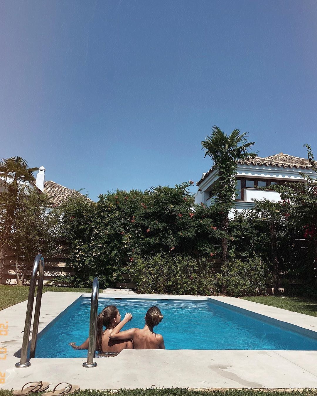 En la segunda pic se puede ver a Expósito junto a una amiga en la pileta aparentemente tomando sol sin nada puesto arriba, para no dejar marca de tiras.