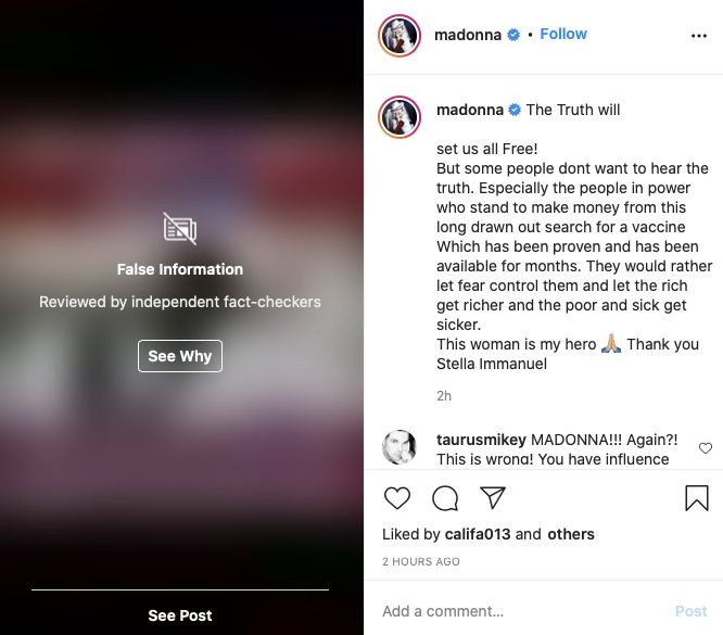 "La verdad nos hará libres. Pero algunas personas no quieren escuchar la verdad. Especialmente aquellos en el poder que prefieren ganar dinero con la larga búsqueda de la vacuna. La cual ha sido probada y está disponible desde hace meses. Ellos prefieren que el miedo tome el control y permitir que los ricos se hagan más ricos y los pobres y enfermos se pongan aún más enfermos" fue el texto que acompaño el controversial video de Madonna.