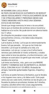 Una joven que dice ser la hija de Oscar Righi, ex guitarrista de la Bersuit Vergarabat, denunció al músico de haberla abusado sexualmente. En un posteo que compartió en su cuenta de Facebook, red social donde se apoda bajo el nombre Umé Boshi, relató su historia.