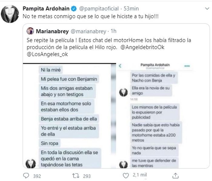 "No te metas conmigo que sé lo que le hiciste a tu hijo", fue el tweet que habría escrito Pampita, al ver en una cuenta falsa de Brey que publicaban mensajes suyos, de 2015, hablando de la supuesta infidelidad de Benjamín Vicuña con la China Suárez.