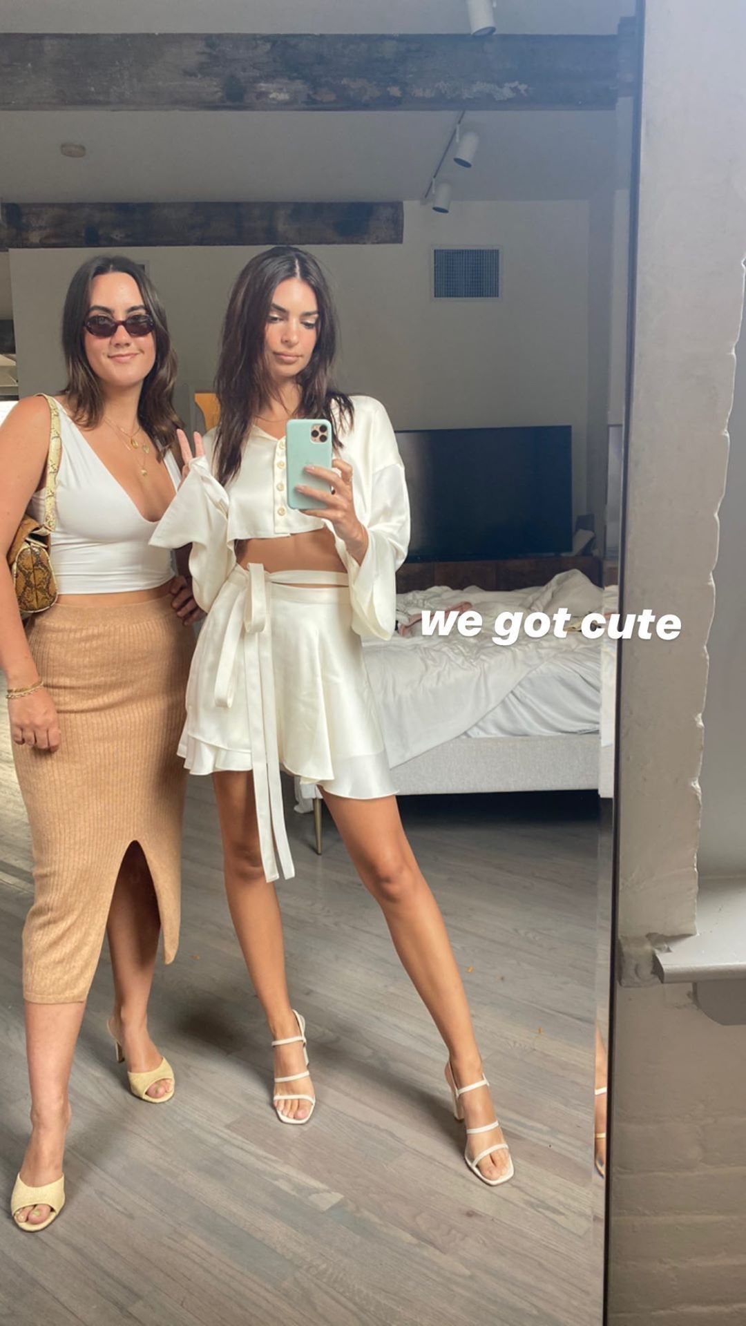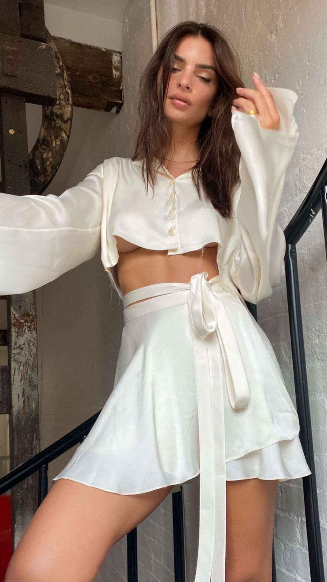 Volviendo a las nuevas fotografías publicadas por Emily Ratajkowski en su cuenta de Instagram personal, en ellas se puede ver a la joven norteamericana con una blusa mangas anchas blanca y una falda con lazo del mismo tono.
