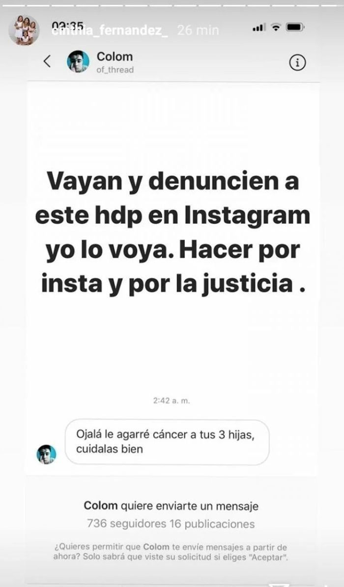 "Ojalá le agarre cáncer a tus tres hijas, cuidalas bien", expresó el usuario de la red social. Cinthia, al ver este mensaje, expresó su total indignación y adelantó que lo llevará a la justicia.
