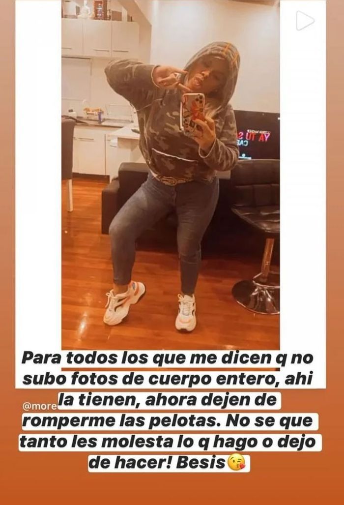 Hoy, conforme con su cuerpo lo muestra sin problemas. Pero muchos de sus seguidores critican sus decisiones frente a las redes sociales. Por ese motivo, la joven publicó una foto de cuerpo entero y expresó: "Para todos los que me dicen que no subo una foto de cuerpo entero, ahí la tienen, ahora dejen de romperme las pel#tas. No sé qué tanto les molesta lo que hago o dejo de hacer, besis".