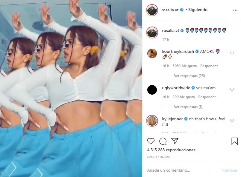 Debido a esto en su última publicación de Instagram, Rosalía subió un video donde se la ve cantando y bailando desde su baño lo que provocó el comentario de Kylie Jenner y de Kourtney Kardashian.
