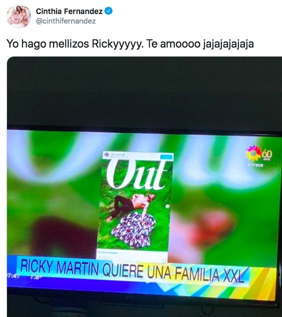 La noticia de que Ricky sueña con una familia numerosa llegó a todos los medios. En ese contexto, Cinthia Fernández le sacó una foto a la pantalla de su TV en la que se lee: "Ricky Martin quiere una familia XXL".
