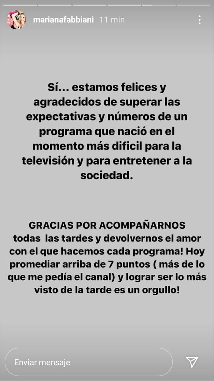 "Sí... Estamos felices y agradecidos de superar las expectativas y números de un programa que nació en el momento más difícil para la televisión y para entretener a la sociedad. Gracias por acompañarnos todas las tardes y devolvernos el amor con el que hacemos cada programa! Hoy promediar arriba de 7 puntos (más de lo que me pedía el canal) y lograr ser lo más visto de la tarde es un orgullo!", expresó en una primera historia de Instagram.