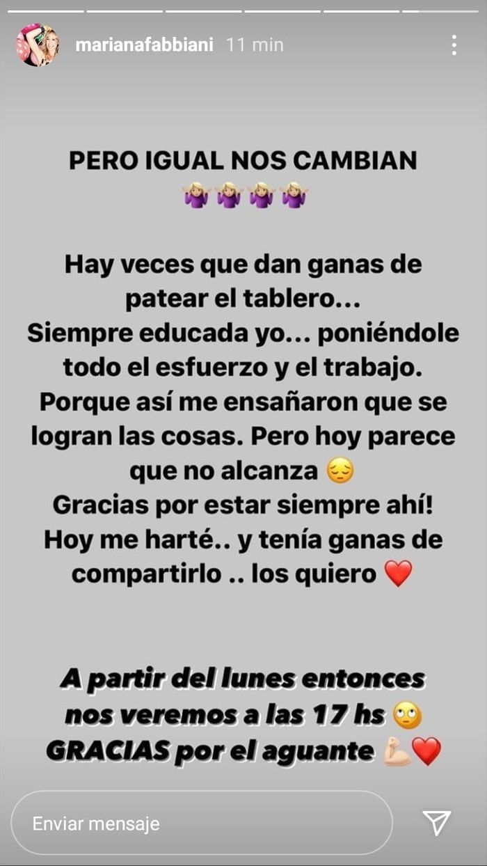 Y remató contundente: "Pero igual nos cambian. Hay veces que dan ganas de patear el tablero... Siempre educada yo... Poniéndole todo el esfuerzo y el trabajo. Porque así me enseñaron que se logran las cosas. Pero hoy parece que no alcanza. Gracias por estar siempre ahí! Hoy me harté y tenía ganas de compartirlo... Los quiero".