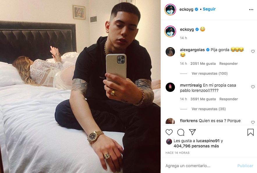 El joven artista, que tiene más de tres millones de seguidores, compartió una selfie frente a la cama en la cual se lo ve sentado sobre un extremo de la cama. Detrás de él, se ve acostada a una mujer de espaldas y mirando su celular. Solo dos detalles ser logran percibir de ella: es rubia y tiene un enorme tatuaje en su brazo que llega hasta su mano.