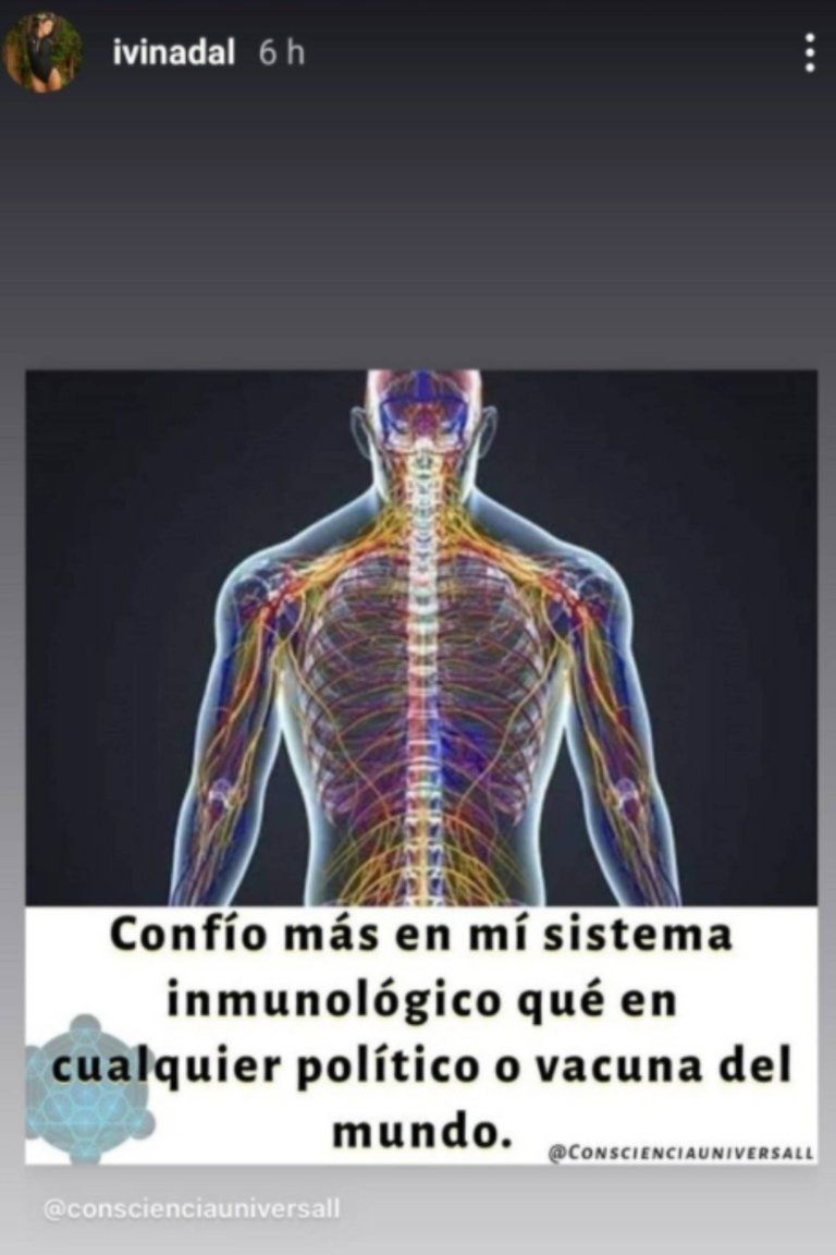 Ivana Nadal generó una nueva polémica en las redes sociales con un llamativo posteo en sus redes sociales. En su cuenta oficial de Instagram, la influencer compartió con sus más de 2 millones de seguidores una historia en la que aparecía la imagen de un cuerpo humano con un fuerte mensaje: "Confío más en mi sistema inmunológico que en cualquier político y vacuna del mundo".