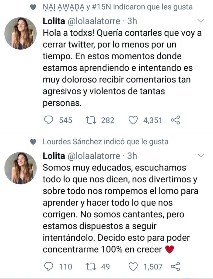 "Somos muy educados, escuchamos todo lo que nos dicen, nos divertimos y sobre todo nos rompemos el lomo para aprender y hacer todo lo que nos corrigen. No somos cantantes, pero estamos dispuestos a seguir intentándolo. Decido esto para poder concentrarme 100% en crecer ♥️", finalizó.